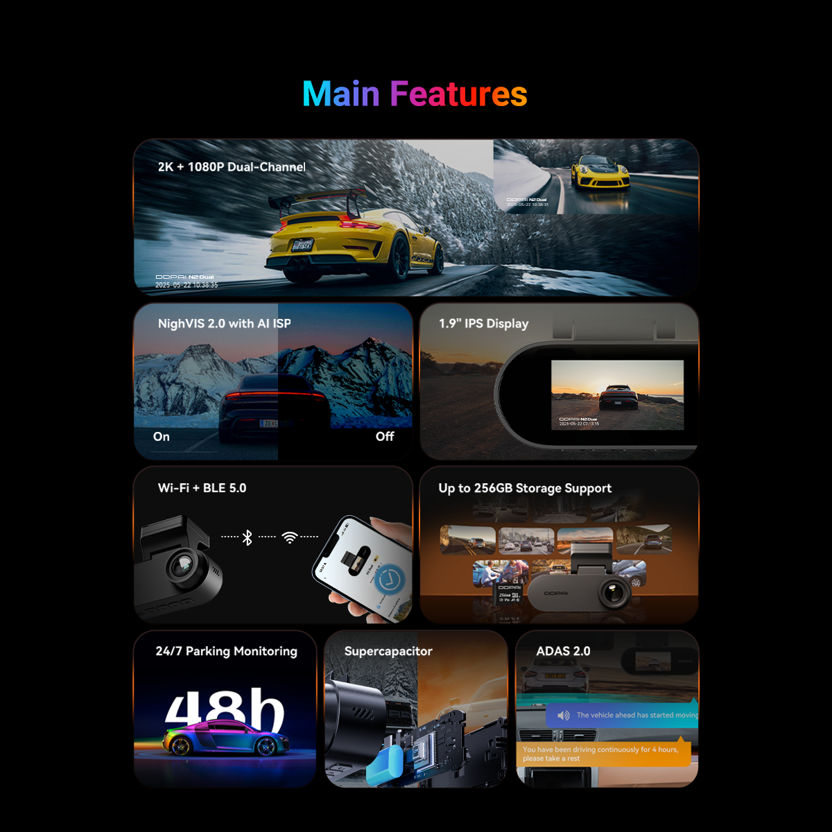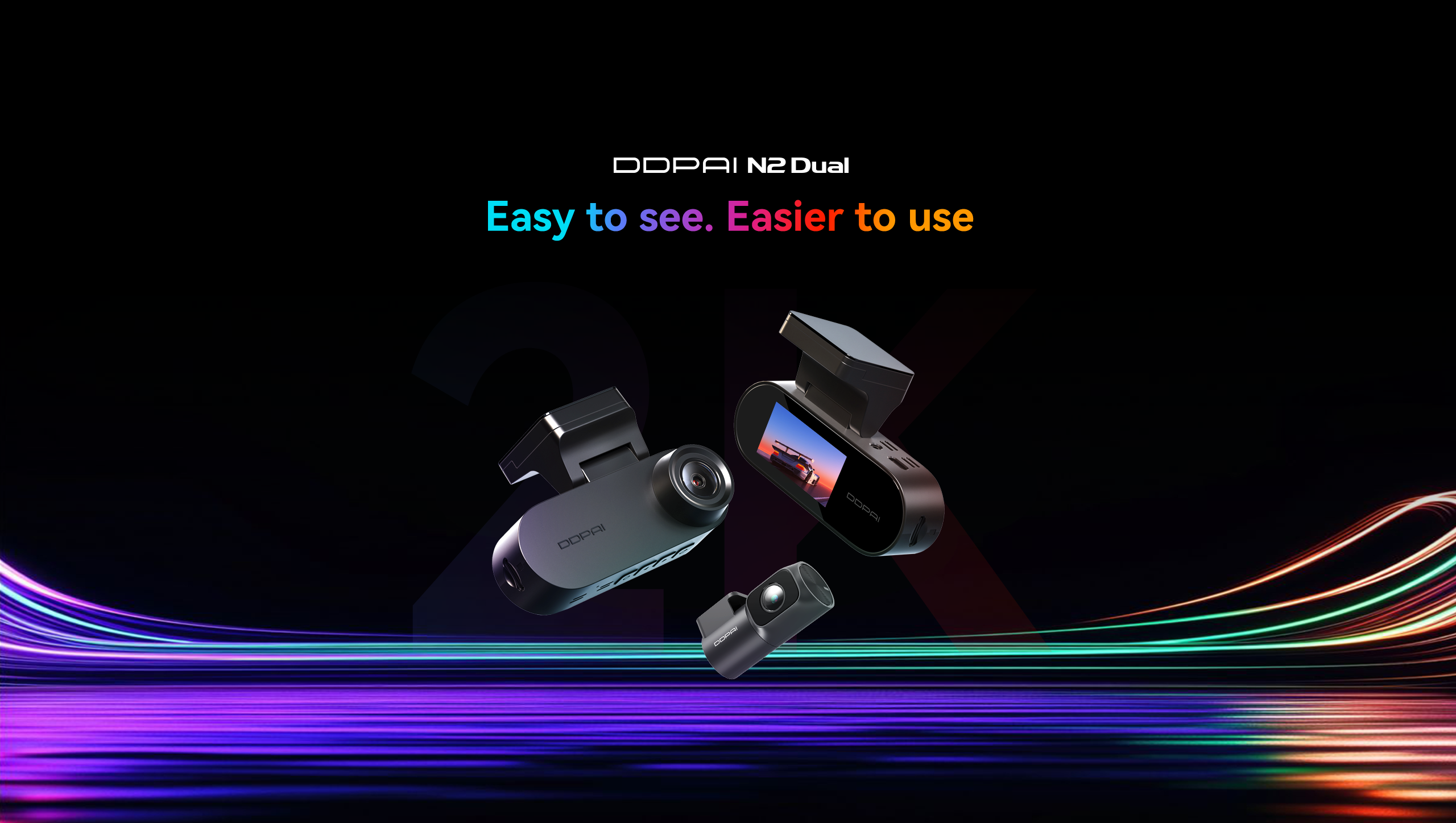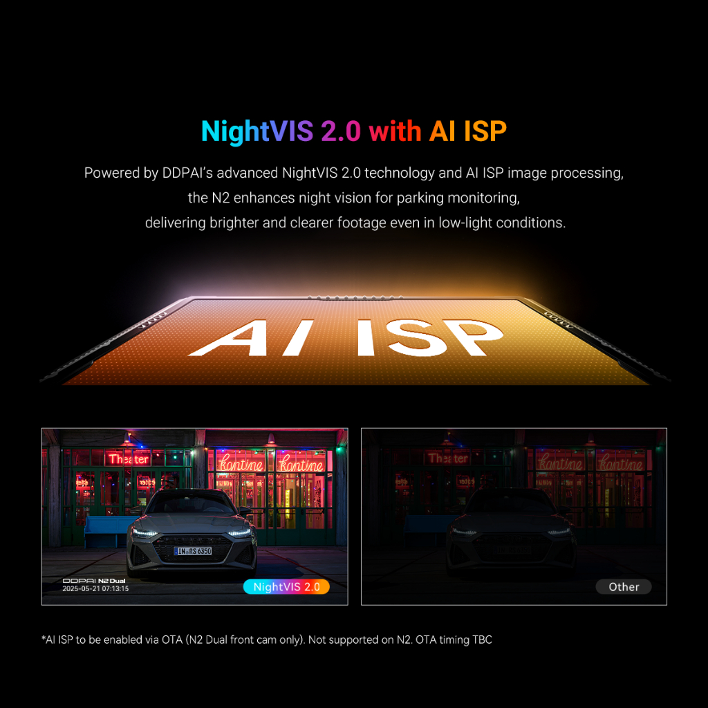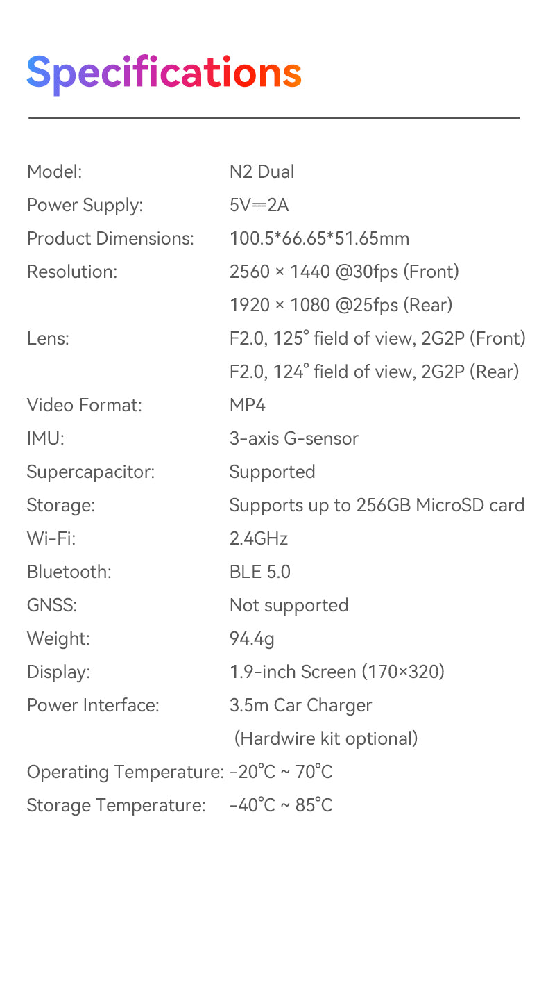 DDPAI N2 Dual records in crisp 2K QHD camera. It also comes with NightVIS 2.0 technology and AI-powered image processing. To bring next-level convenience, the new-gen N2 Dual is also paired with a 1.9” screen for on-device viewing.