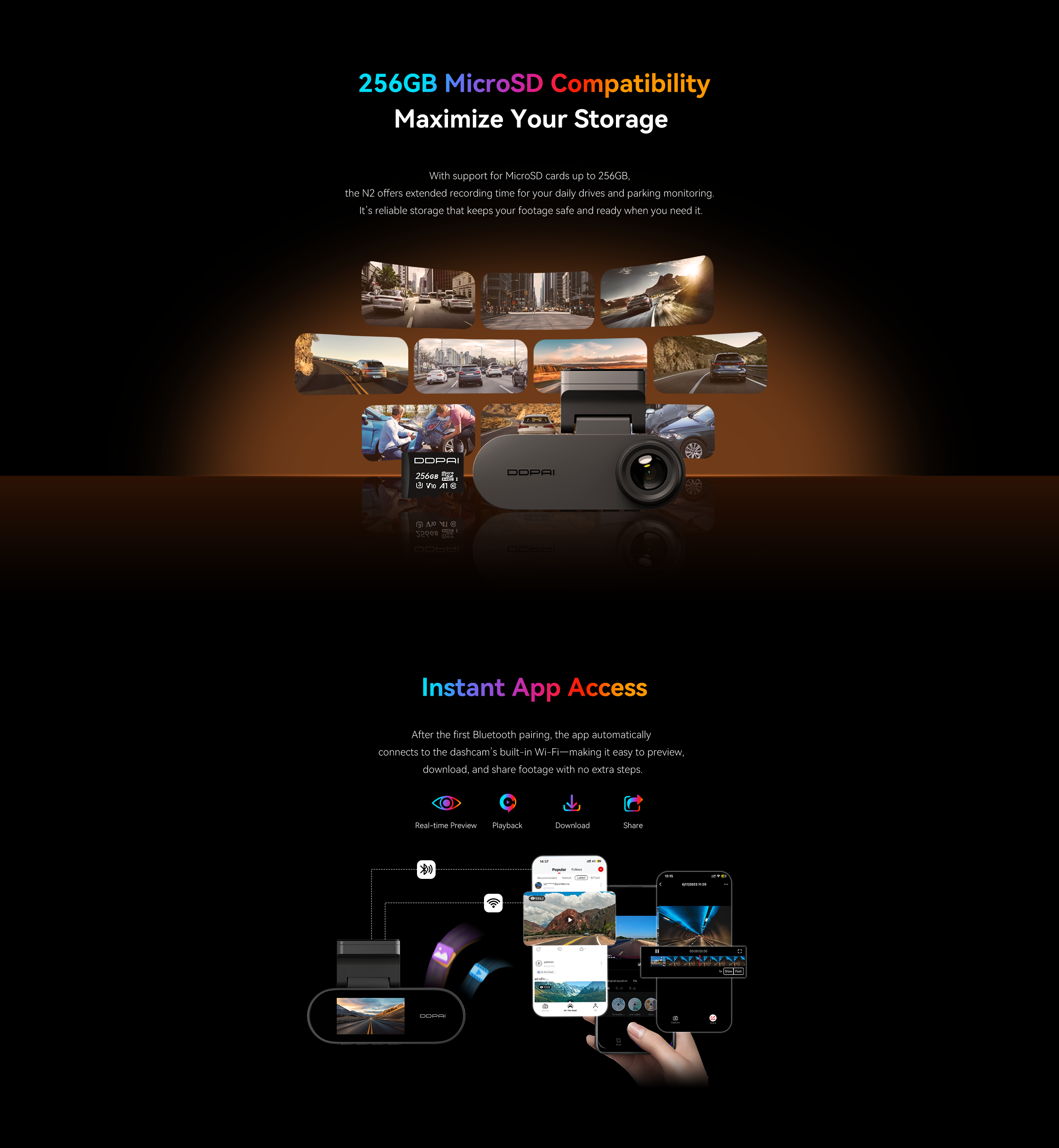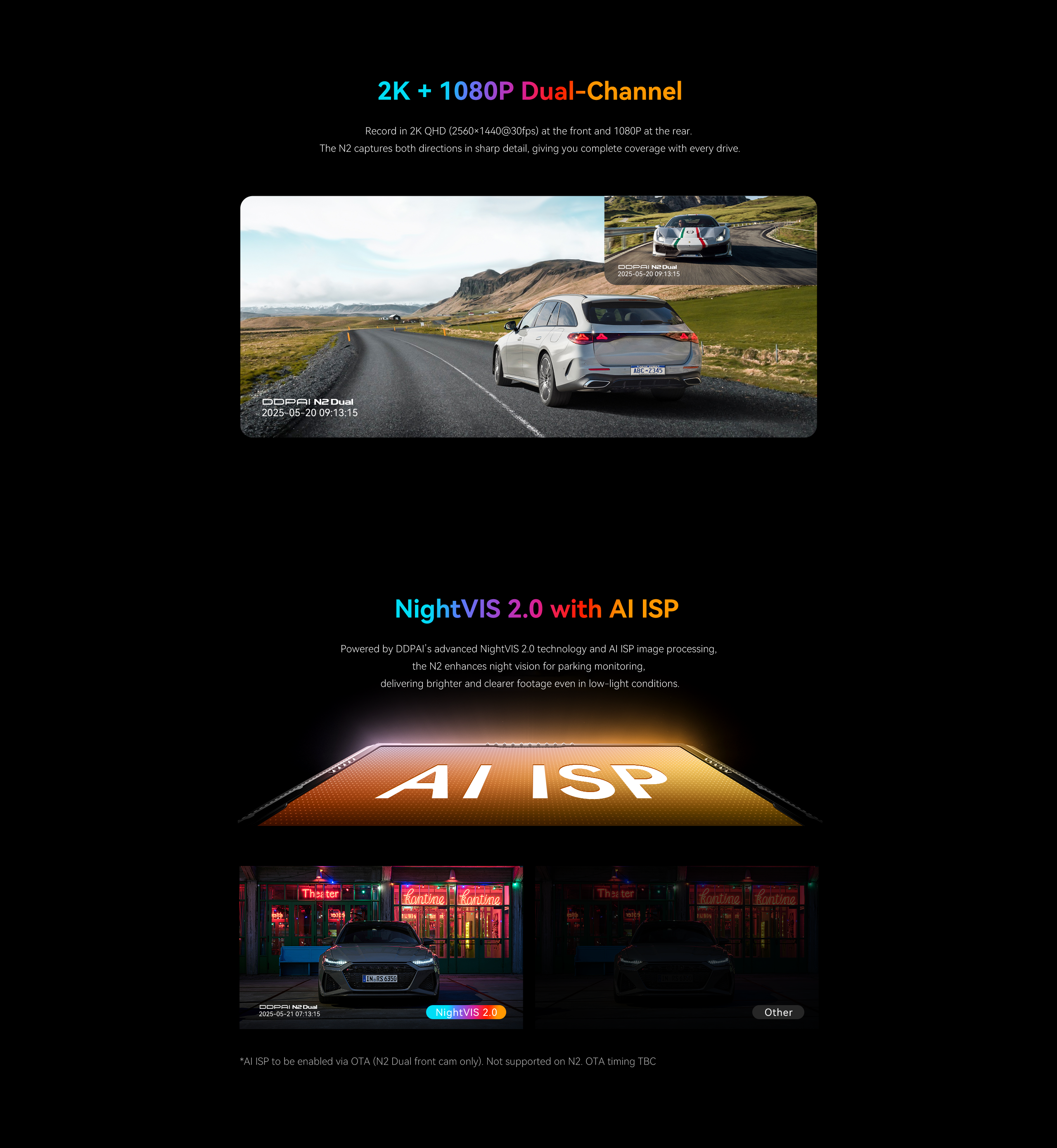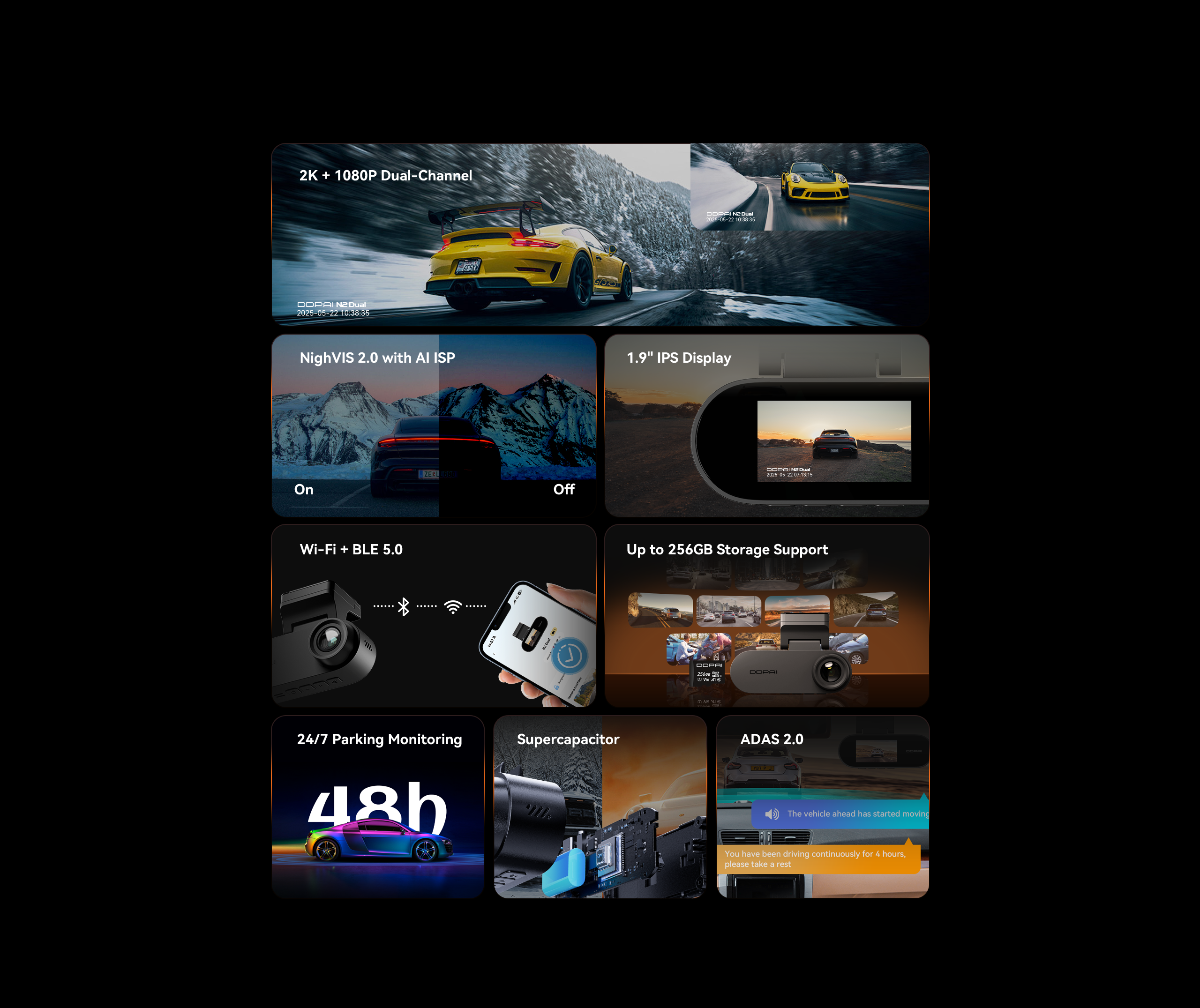 DDPAI N2 Dual records in crisp 2K QHD camera. It also comes with NightVIS 2.0 technology and AI-powered image processing. To bring next-level convenience, the new-gen N2 Dual is also paired with a 1.9” screen for on-device viewing.