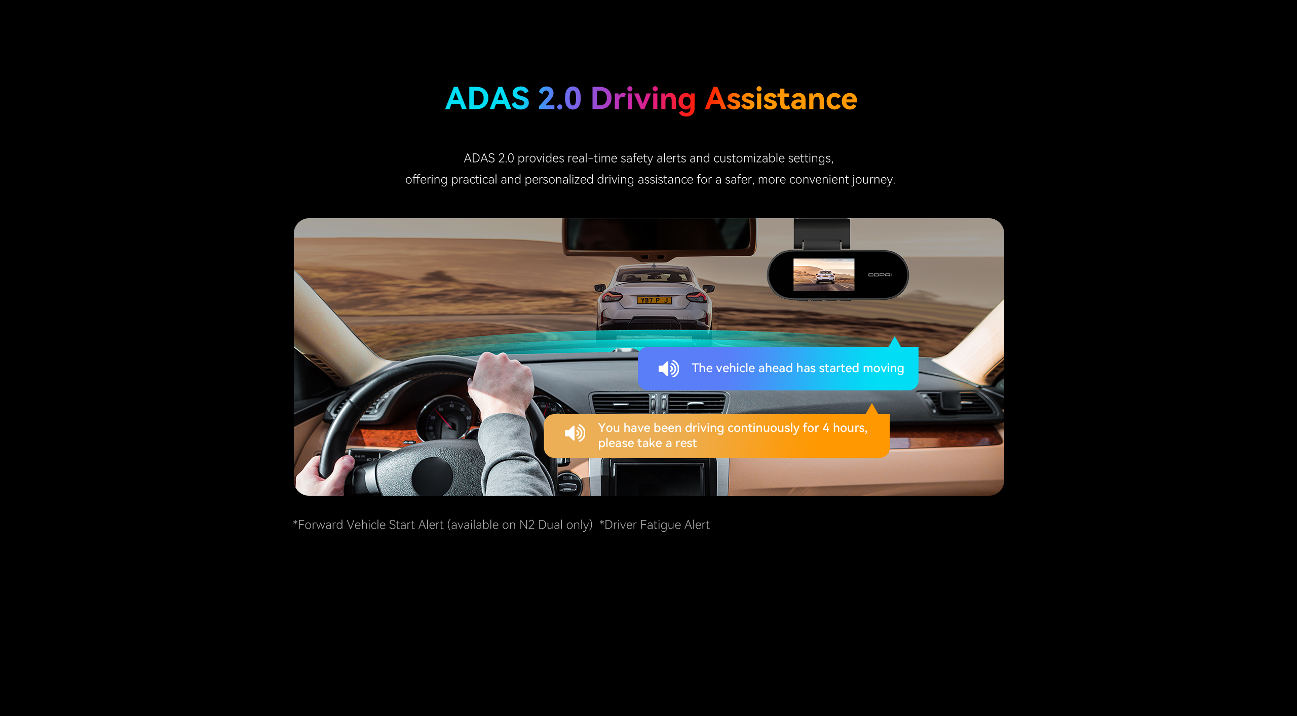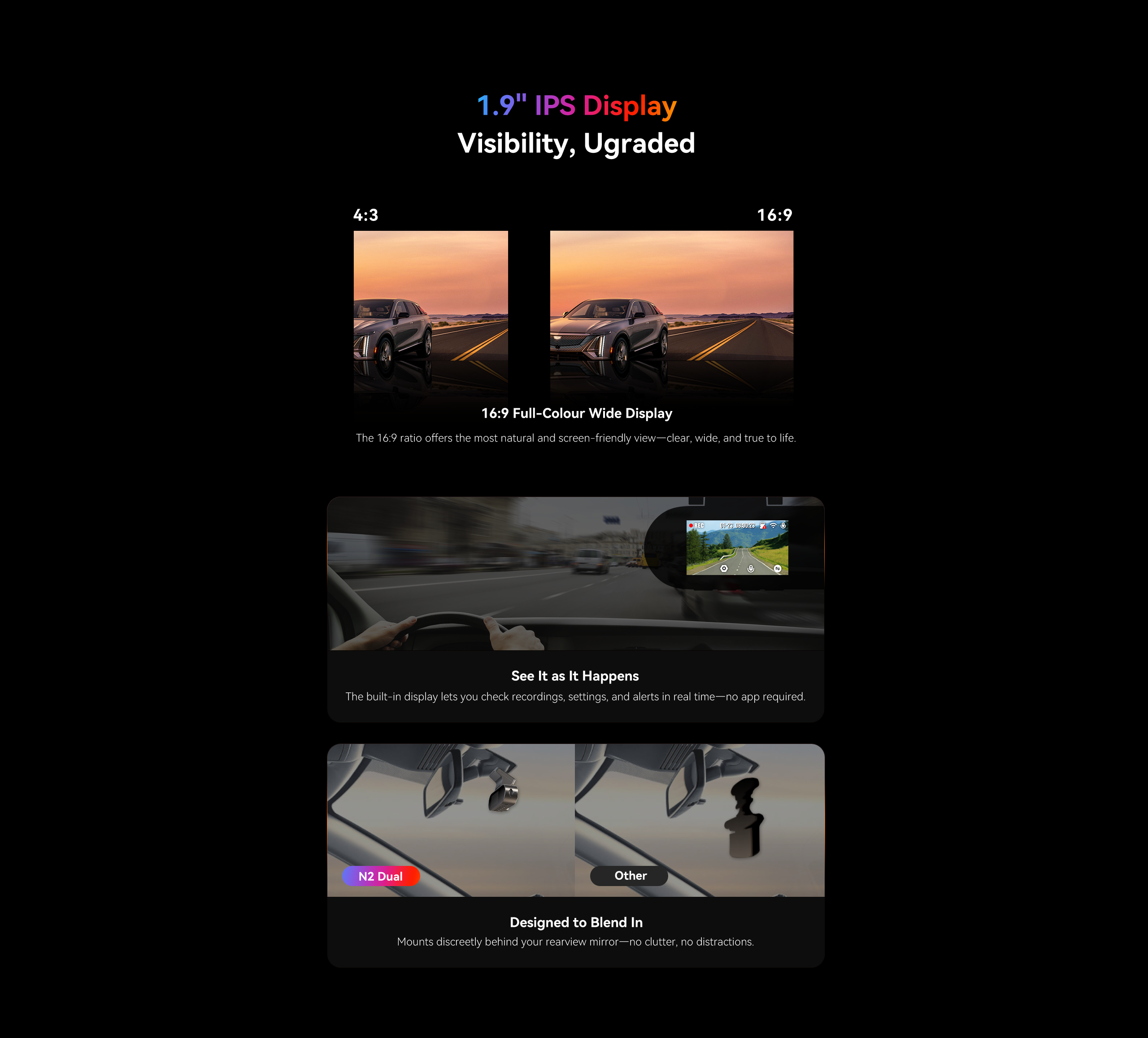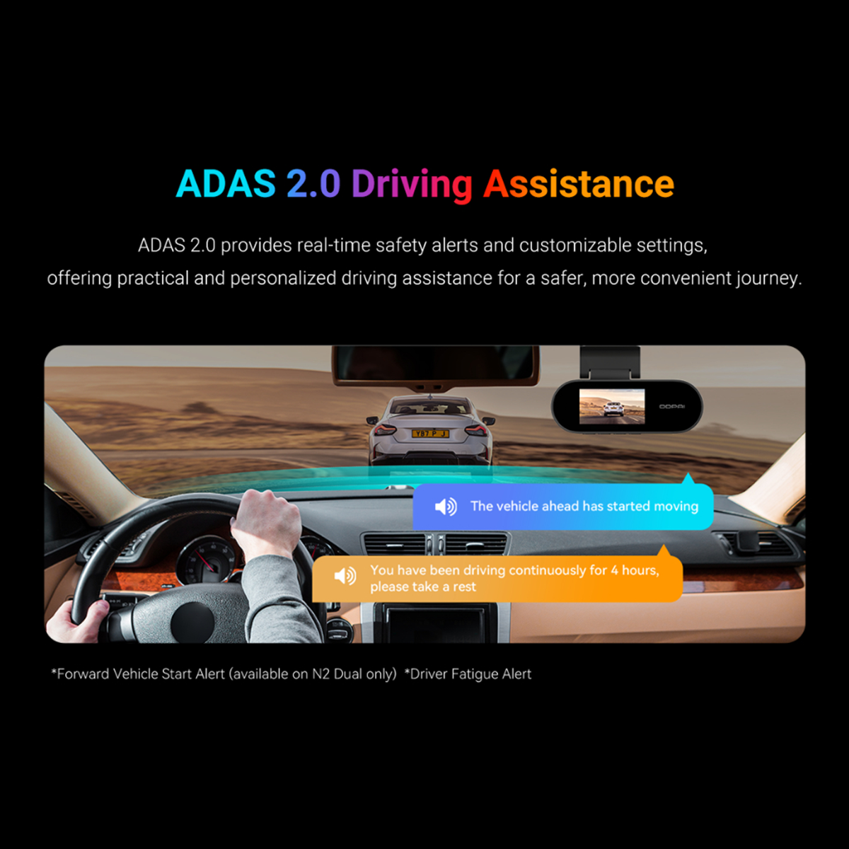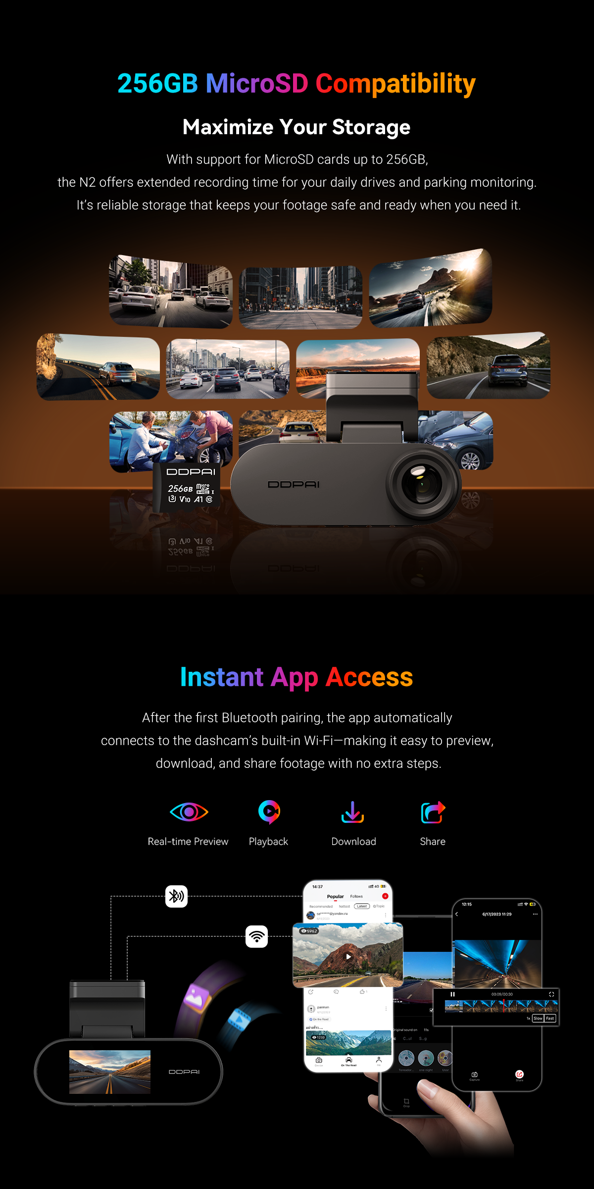 DDPAI N2 Dual records in crisp 2K QHD camera. It also comes with NightVIS 2.0 technology and AI-powered image processing. To bring next-level convenience, the new-gen N2 Dual is also paired with a 1.9” screen for on-device viewing.
